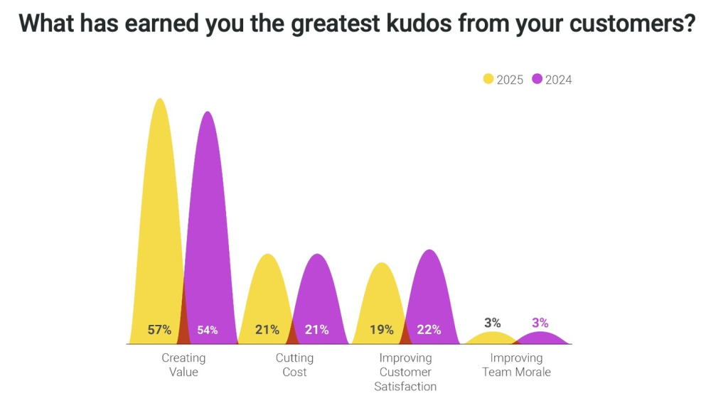 57% of GBS leaders say creating value earns them the greatest recognition from customers, compared to just 21% for cost reduction